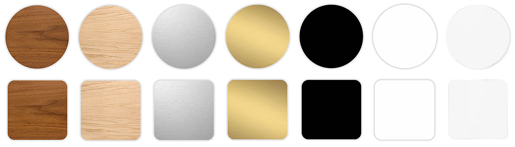 - Plexiglas : Noir, doré, argent, blanc, transparent
