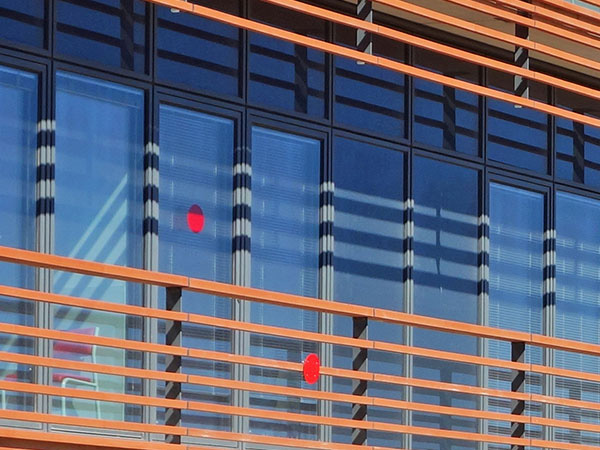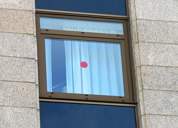 Placement stratégique : Les pastilles rouges sont placées sur les fenêtres ou les surfaces vitrées à des endroits stratégiques et facilement visibles de l'extérieur pour les équipes de secours.